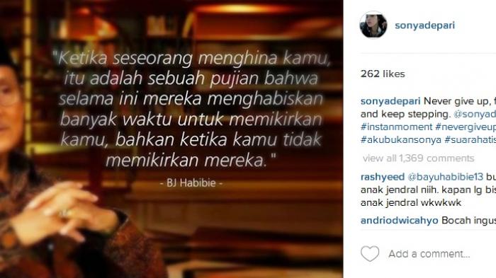 Dibully oleh banyak netizen, akun sonyadepari memposting sebuah gambar Presiden BJ Habibie dengan petuahnya di akun instagram.