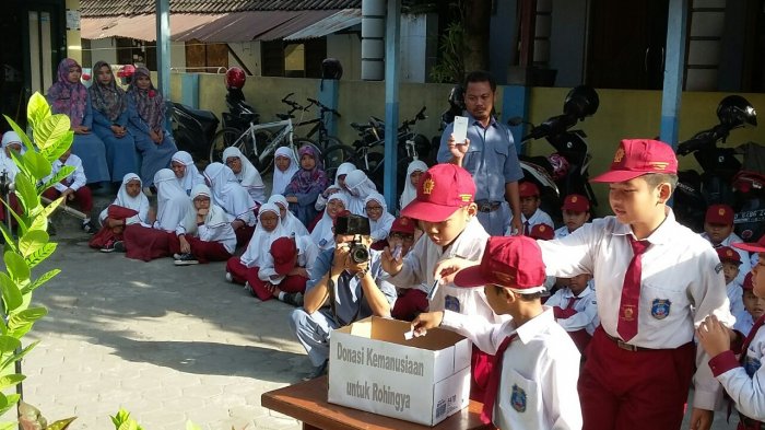 TRIBUNSOLO.COM, KARANGANYAR - SD Muhammadiyah Plus Malangjiwan, Colomadu, Karanganyar, melakukan aksi peduli Rohingya di halaman sekolah, Senin, 11 September 2017.