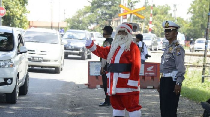 Aksi sinterklas membantu polisi menyadarkan warga pentingnya tertib berlalu lintas untuk keselamatan saat berkendara di jalan raya.