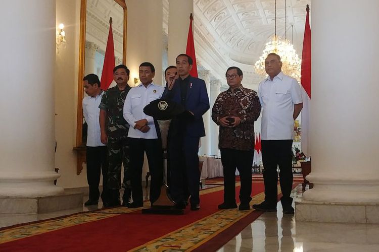 Jokowi didampingi Menteri Koordinator Bidang Politik, Hukum dan Keamanan, Wiranto; Panglima TNI, Marsekal Hadi Tjahjanto; Kepala Badan Intelijen Negara, Budi Gunawan; Wakil Kepala Polri, Komjen Syafruddin.
