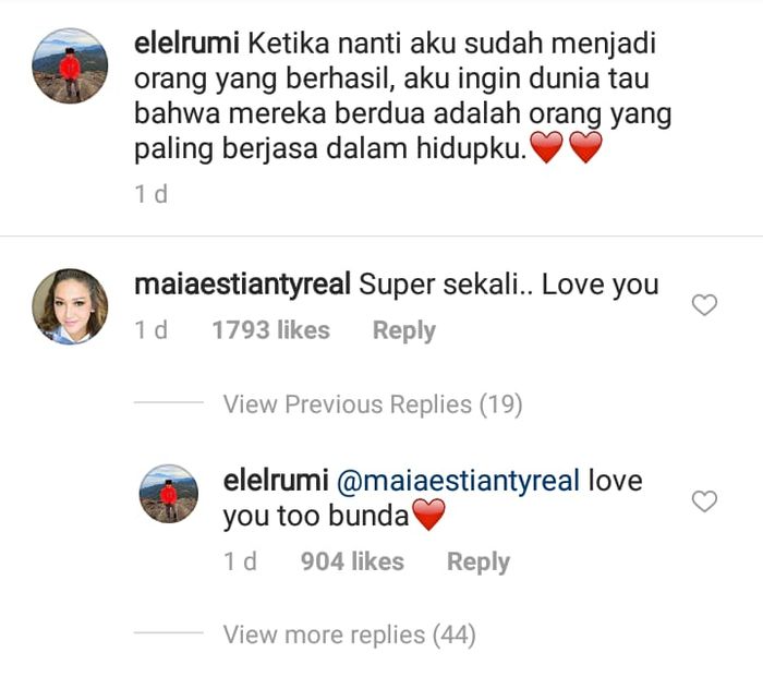 Tak mau diam begitu saja, El membalas komentar Maia dengan kalimat: love you too bunda, lengkap dengan emotikon love.