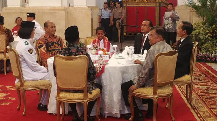Mengenakan baju seragam putih biru SMP yang dipadukan dengan kain khas NTT, Joni pun duduk satu meja dengan Jokowi dan Jusuf Kalla.