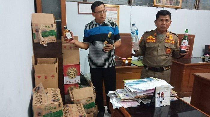 Petugas satpol PP saat menunjukan miras sitaan di kantor satpol PP Sukoharjo, Jumat (3/5/2019).