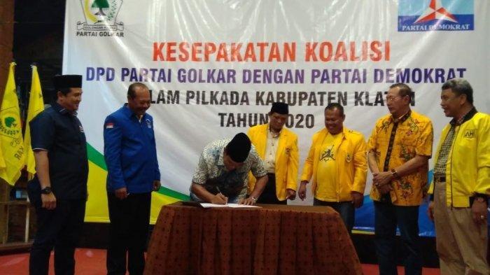 DPD I Partai Golkar Kabupaten Klaten bersama DPC Partai Demokrat Kabupaten Klaten menandatangi nota kesepakatan koalisi kedua partai di Resto Merapi, di Jalan Merapi, Gayamprit, Kec. Klaten Selatan, Kabupaten Klaten, Kamis (27/2/2020) malam.