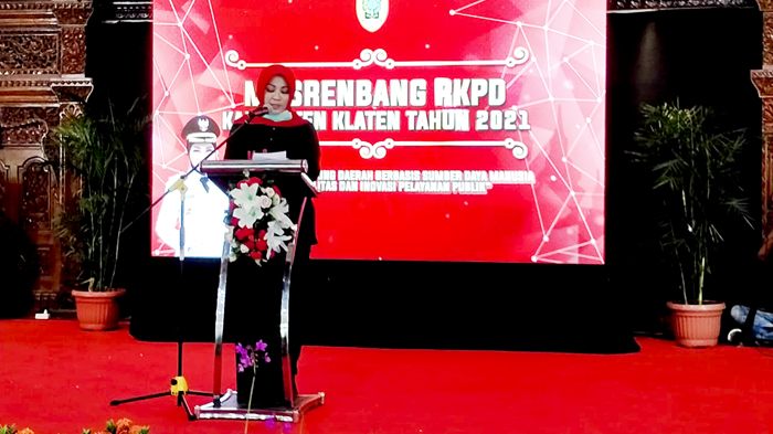 Bupati Klaten Sri Mulyani memberikan sambutan di acara Musrembang RKPD 2021 di Pendopo Pemkab Klaten, Selasa (31/3/2020)