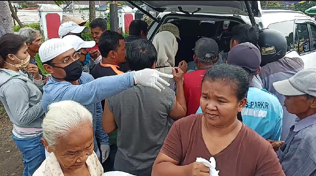 Masyarakat seperti tukang becak, parkir, dan pedagang kaki lima ikut mengambil sembako yang diberikan.