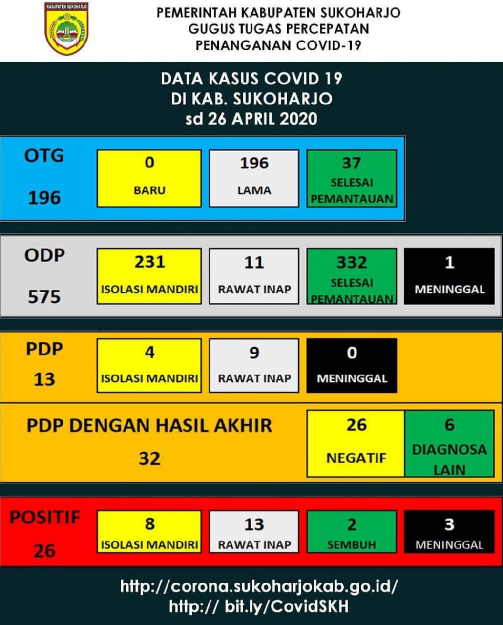 TRIBUNSOLO.COM, SUKOHARJO - Gugus Tugas Percepatan Penanganan Covid-19 Kabupaten Sukoharjo merilis perkembangan kasus Corona (Covid-19) di Sukoharjo, Minggu (26/4/2020).