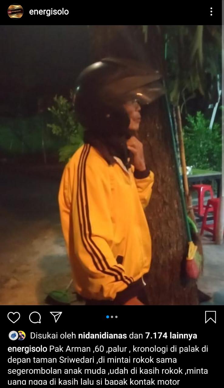 TRIBUNSOLO.COM, SOLO - Sebuah postingan di Media Sosial (Medsos) Instagram viral menceritakan tentang seorang pria bernama Arman (60) yang dipalak dan kunci motornya dirampas gerombolan anak muda.