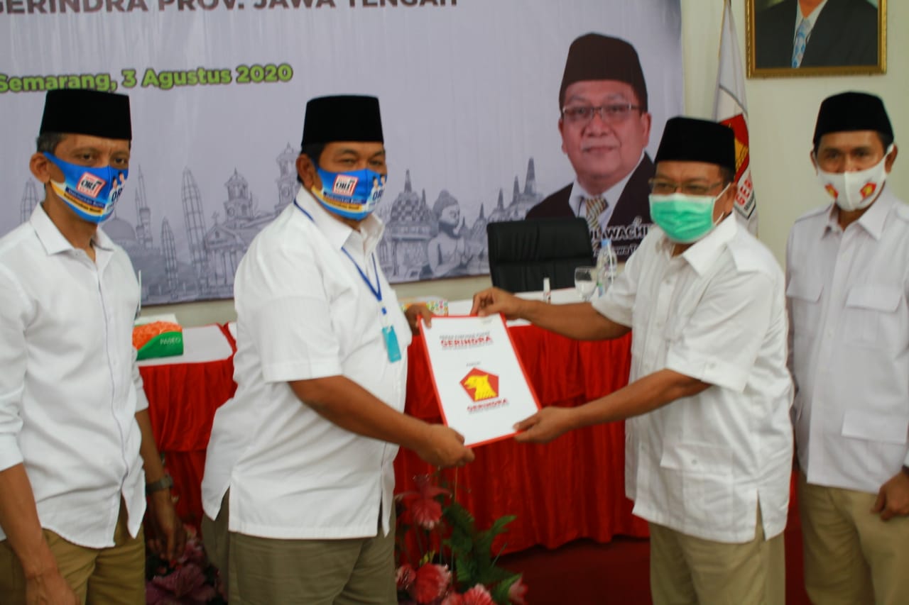 TRIBUNSOLO.COM, KLATEN - Bakal Pasangan Calon Bupati dan Wakil Bupati Kabupaten Klaten, One Krsinata - Muhammad Fajri (ORI) menghadiri penyerahan surat rekomendasi dari Partai Gerindra di DPD Partai Gerindra Jateng, di Kabupaten Semarang, Senin (3/8/2020).