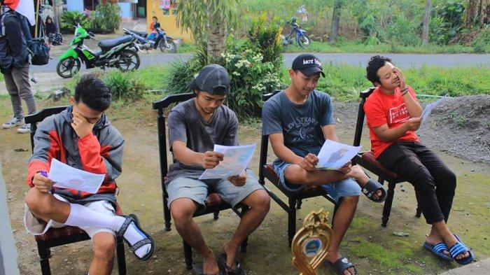 Anam dan ketiga temannya membuat konten lomba menatap foto mantan itu di depan rumah.