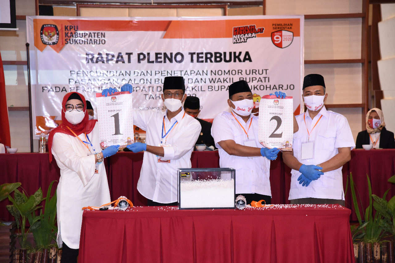 Rapat pleno terbuka pengundian dan penetapan nomor urut ini digelar KPU Sukoharjo di Hotel Tosan Solo Baru, Kecamatan Grogol, Sukoharjo, Kamis (24/9/2020).
