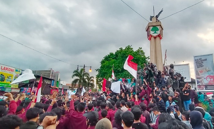 Ribuan mahasiswa dalam aksi #SoloRayaMenggugat menolak Omnibus Law masih bertahan Kamis (8/10/2020) hingga pukul 17.15 WIB.