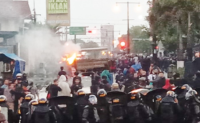 Demo #SoloRayaMenggugat menolak Omnibus Law berakhir ricuh di Tugu Kartasura di Jalan Raya Solo-Semarang, Kecamatan Kartasura, Kabupaten Sukoharjo, Kamis (8/10/2020).