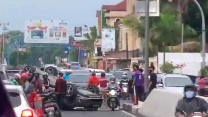 Sebuah mobil jenis Honda Mobilio Nopol AD 8751 HS terguling di Flyover Manahan Solo, Jumat (21/11/2020).