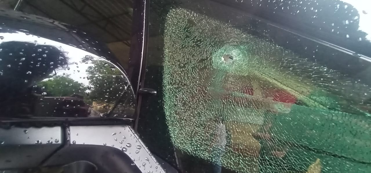 Tembakan tersebut sampai melubangi kaca dan tembus ke jok depan mobil. Namun tembakan tersebut tidak mengenai siapapun.