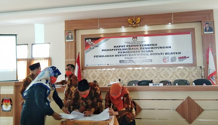 TRIBUNSOLO.COM, KLATEN - Rapat pleno terbuka rekapitulasi hasil perhitungan perolehan suara tingkat kabupaten dalam Pilkada Klaten selesai, Selasa (15/12/2020).