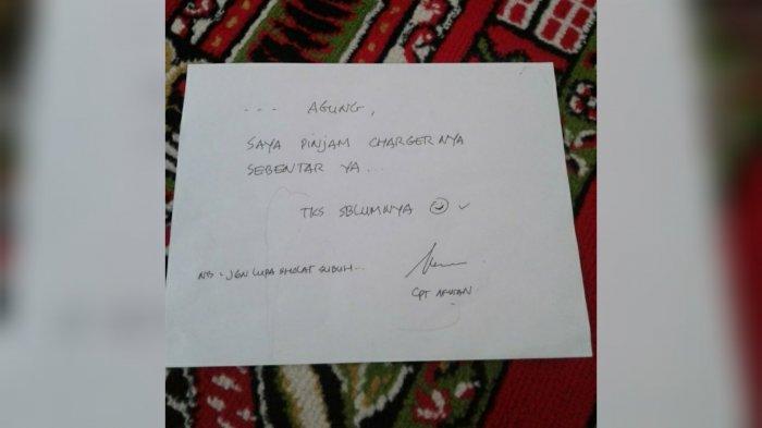 'Saya pinjam chargernya sebentar ya. Tks sebelumnya. Nb: jangan lupa sholat subuh. (Tanda tangan) Cpt Afwan,' begitu isi surat tersebut.