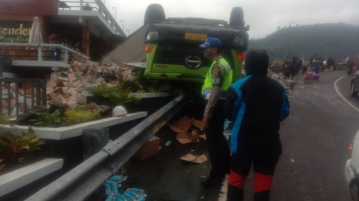 Truk muatan minuman nopol B 9650 KEU terguling di depan Rumah Makan Legender, Tawangmangu, Jumat (22/1/2021) pagi.