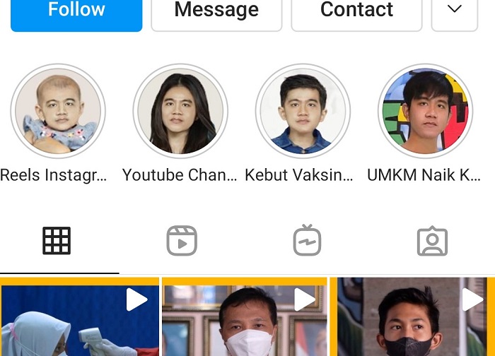Tidak cukup sampai di situ saja, seluruh highlight instastory dari Instagram Gibran juga memiliki wajah sama dengan berbagai raut muka.