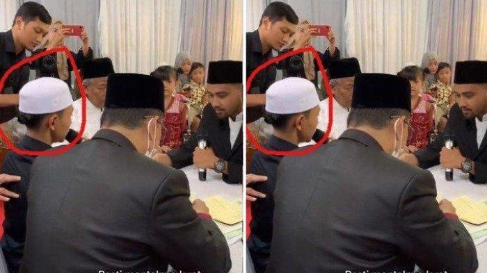 Selain itu, terlihat duduk seorang penghulu dan dua pria yang terlihat lebih tua di sisi kiri dan kanan calon mempelai pria serta bocah yang menjadi wali calon pengantin perempuan.