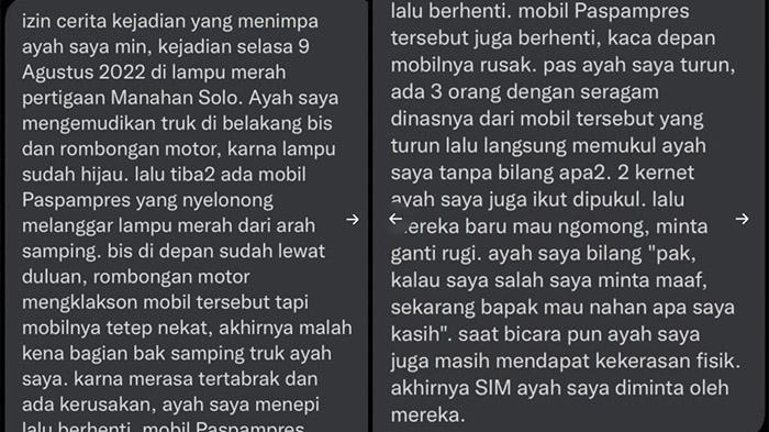 "izin cerita kejadian yang menimpa ayah saya min, kejadian selasa 9 Agustus 2022 di lampu merah pertigaan Manahan Solo. Ayah saya mengemudikan truk di belakang bis dan rombongan motor, karna lampu sudah hijau. lalu tiba2 ada mobil Paspampres yang nyelonong melanggar lampu merah dari arah samping. bis di depan sudah lewat duluan, rombongan motor mengklakson mobil tersebut tapi mobilnya tetep nekat, akhirnya malah kena bagian bak samping truk ayah saya," tulis pesan itu, seperti dikutip TribunSolo.com, Jumat (12/8/2022).