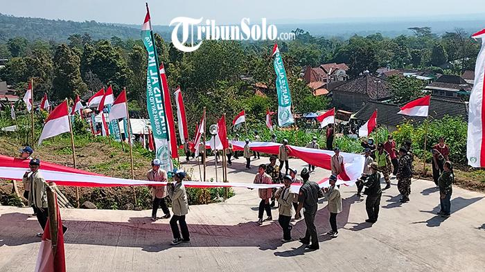 TRIBUNSOLO.COM, BOYOLALI- Bendera Merah Putih sepanjang 165 meter dan 1000 bendera Merah Putih dikirab dari Balai Desa Sukabumi menuju Makam Nggunung, Kecamatan Cepogo, Selasa (23/8/2022).