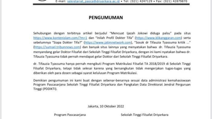"Dengan ini kami menyatakan bahwa dr. Tifauzia Tyassuma tidak pernah mendapatkan gelar Doktor dari Sekolah Tinggi Filsafat Driyarkara," tulis rilis tersebut yang ditandatangani Ketua Sekolah Tinggi Filsafat Driyarkara, Thomas Hidya Djaya, Rabu (12/10/2022.