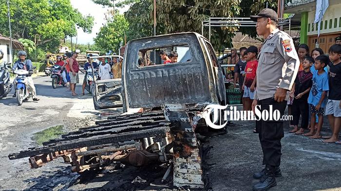 TRIBUNSOLO.COM, KLATEN - Sebuah mobil pikap ludes terbakar di jalan raya Trucuk -Cawas, di dukuh Bawukan, Desa Kalikebo, Kecamatan Trucuk, Klaten, Kamis (8/6/2023).
