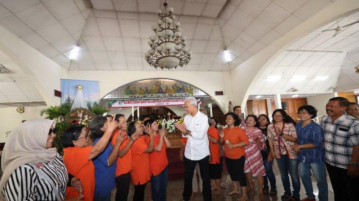Saat berkunjung ke Gereja Katolik Sp Maria Regina Purbowardayan, Ganjar disambut antusias para jama yang siap melaksanakan Misa natal.