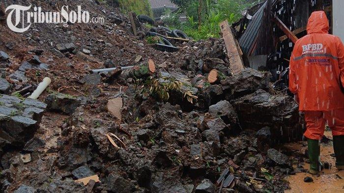 TRIBUNSOLO.COM, KARANGANYAR - Hujan deras mengguyur Kabupaten Karanganyar, menyebabkan tanah longsor, Sabtu (10/2/2024) siang. Akibat kejadian tersebut rumah milik warga di Kecamatan Ngargoyoso, Kabupaten Karanganyar rusak.
