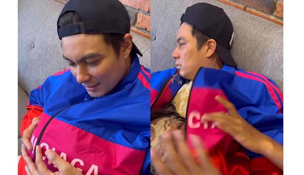 Baim sendiri tampak mengusap kepala orang yang bersembunyi di balik jaket dan menciuminya beberapa kali.