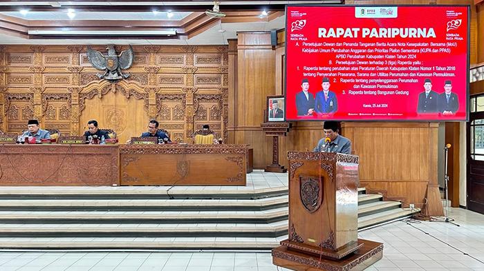 TRIBUNSOLO.COM, KLATEN - Pendapat akhir Bupati Klaten Sri Mulyani disampaikan Wakil Bupati (Wabup) Klaten Yoga Hardaya dalam Rapat Paripurna yang digelar DPRD Klaten di Ruang Rapat Paripurna pada Kamis (25/7/2024).
