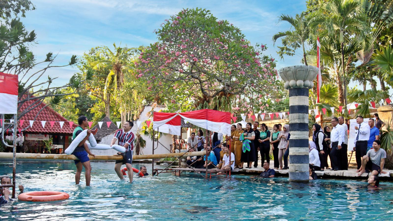 Dilanjutkan lomba tepuk guling dan makan kerupuk di swimming pool pada Kamis (15/8).