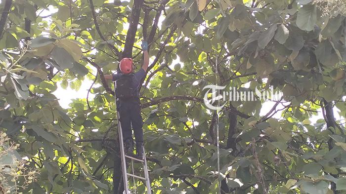 Secara perlahan dan hati-hati, petugas kemudian memanjat tangga dan pohon jati itu.