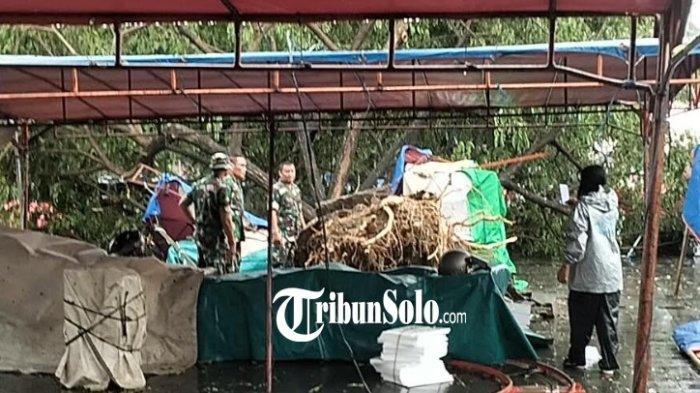 Hujan Es dan Angin di Karanganyar, Pohon Besar Tumbang Dagangan Milik PKL di Alun-alun Berserakan