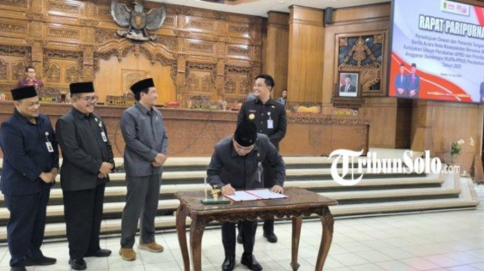 TRIBUNSOLO.COM, KLATEN - Dewan perwakilan rakyat daerah (DPRD) Kabupaten Klaten menandatangani kesepakatan MoU dengan Bupati Hamenang, dalam sidang paripurna di Ruang Sidang Paripurna DPRD Klaten, Kamis (12/6/2025).