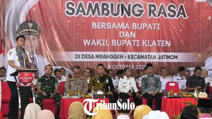 TRIBUNSOLO.COM, KLATEN - Bupati Klaten Hamenang Wajar Ismoyo menerima aspirasi masyarakat, terkait target smart village hingga persoalan tukar tanah kas desa dalam kegiatan Sambung Rasa di Gedung Wijaya Kusuma, Desa Mranggen, Kecamatan Jatinom, Klaten, Rabu (8/10/2025).